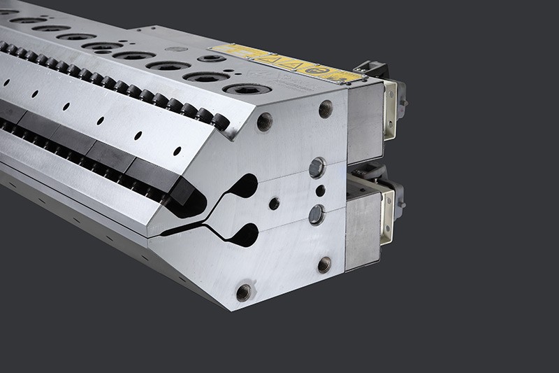 模頭具有流線型流道表面,兩半型模身解體,清理簡(jiǎn)單易行,手動(dòng)微調(diào)彈性模唇或可 推拉式上模唇設(shè)計(jì),以適合擠出產(chǎn)品的不同厚度要求,模頭有效寬度可達(dá)8000mm,可 生產(chǎn)單層、多層共擠復(fù)合流延薄膜產(chǎn)品,配套相應(yīng)擠出機(jī)可生產(chǎn)PP、PE、PVB、EVA 流延膜。CPP、CPE、PVDC、EAA含EVH及PA的阻隔膜,常用于食品包裝、文具膜、 粘接膜、保鮮膜等。