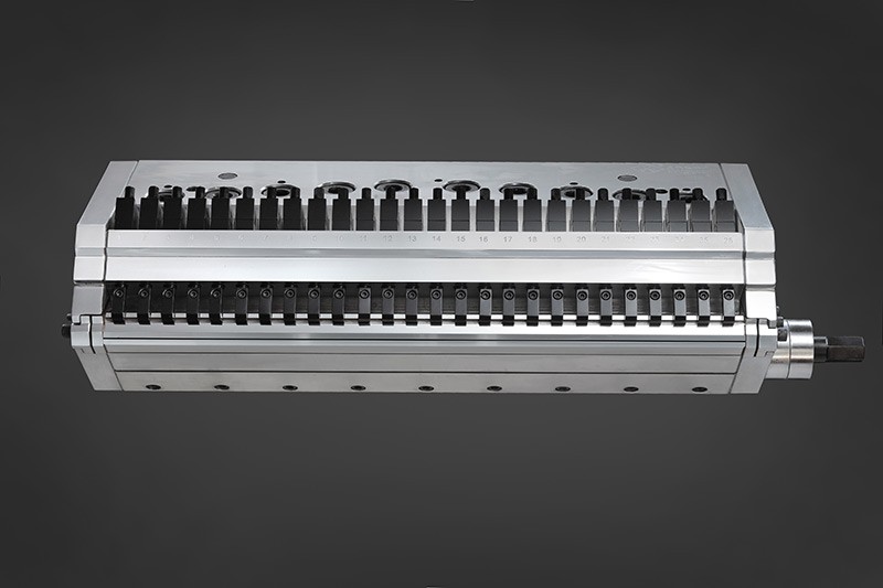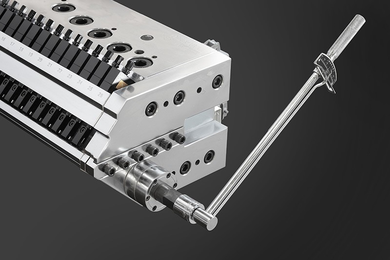 快速開口:快速開口調(diào)節(jié)裝置,在線無需停機快速調(diào)節(jié)模唇開度。快速高效調(diào)節(jié),工時由普通模頭的 20分鐘縮短至3分鐘。