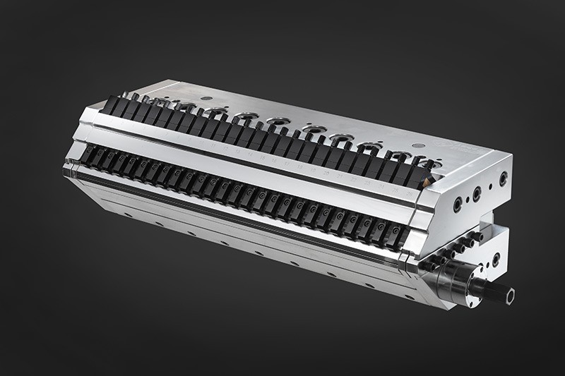 在線寬度調(diào)節(jié):無需停機連續(xù)調(diào)整不同寬度,分為內(nèi)堵式和外堵式調(diào)節(jié)結(jié)構(gòu)能滿足不同物料,不同模 頭外形結(jié)構(gòu)的使用,并且可根據(jù)不同的應(yīng)用要求設(shè)計多種寬幅調(diào)節(jié)機構(gòu) 。