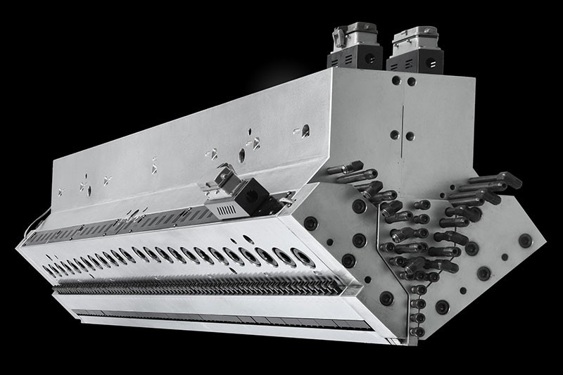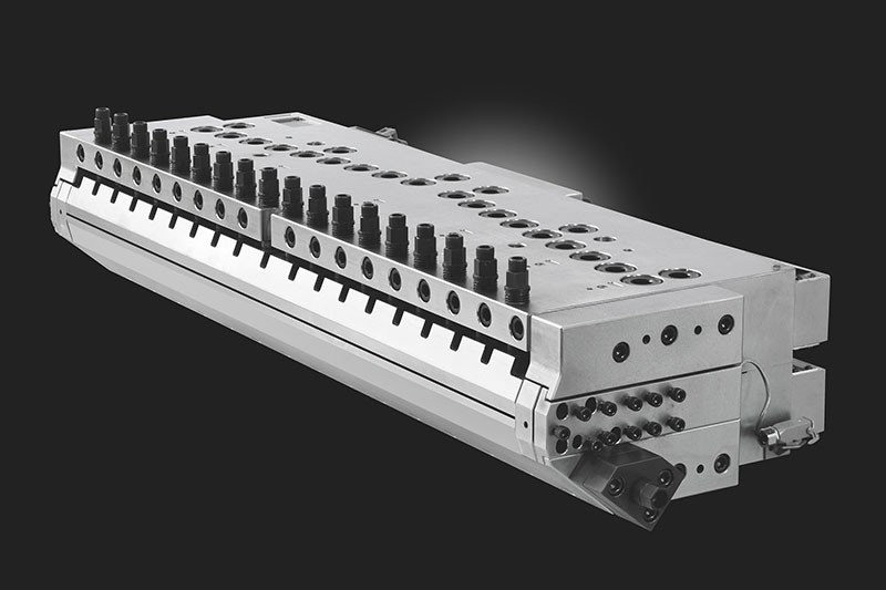 Each layer of flow channel is specially designed for each specific polymer. Comparing with co-extrusion through die and feed block, Multilayer manifold die can get more uniform and accurate proportion of each layer of polymer. There are separate temperature control units in each layer of flow channel, with heat insulation device.